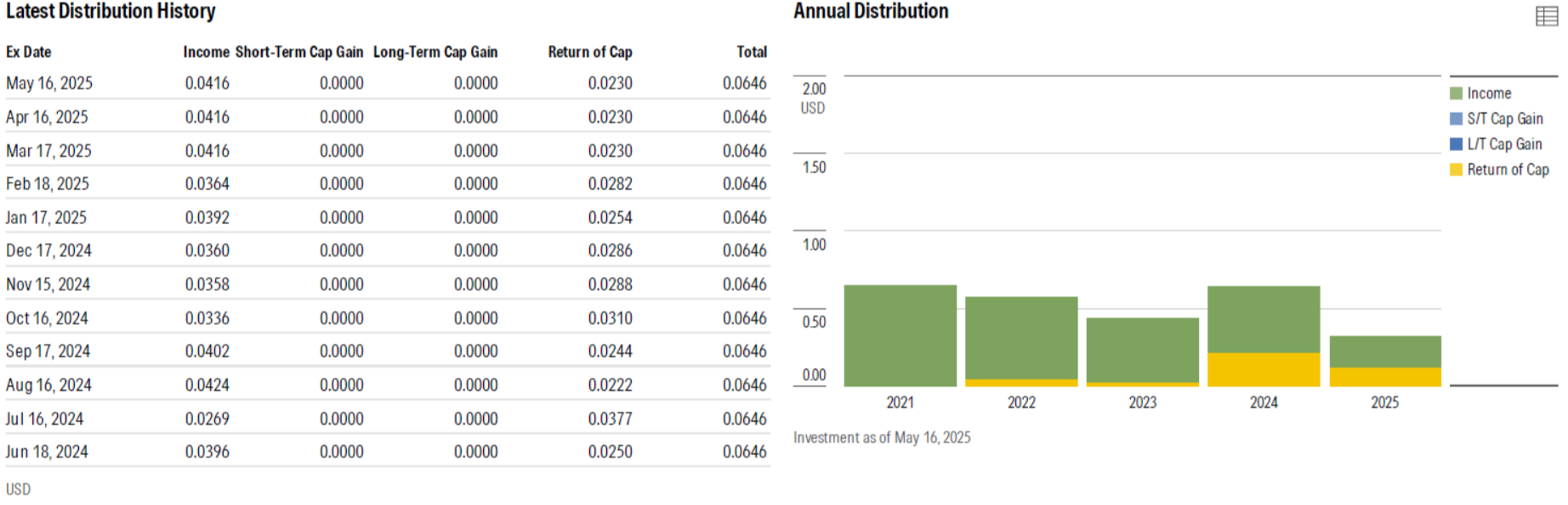 What was described as “dividend” yield is, in fact, a “distribution” yield. According to Morningstar data, a significant portion of the municipal bond fund’s distribution consists of return of capital, which has been counted as yield in recent years. Essentially, the fund is returning maturing bond principal to shareholders, thereby overstating the income yield.