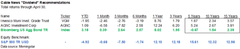 The segment featured a regular contributor whose expertise centers on “dividend yield.” His recommended investments, shown in the table below, featured stated yields of 8.2% and 16%, respectively. The first is a municipal bond closed-end fund, and the second is a leveraged mortgage Real Estate Investment Trust (REIT) with a financial leverage ratio of 11.4, according to Morningstar. In practical terms, this means the REIT uses $10.40 of debt for every $1 of equity to finance its assets.