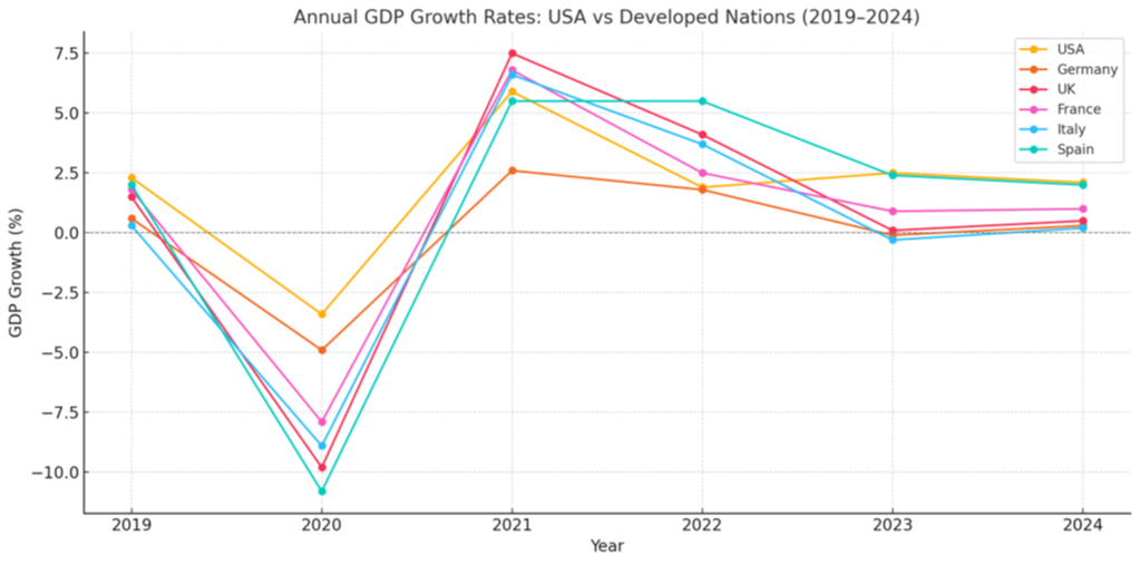 But that is exactly what happened. Many other factors contributed to the U.S. economy’s relatively smooth soft landing, but when compared to other developed nations, the difference is stark. While much of the developed world slipped into recession or stagnation, the U.S. economy powered through the post-pandemic disruption with greater resilience (source: International Monetary Fund).